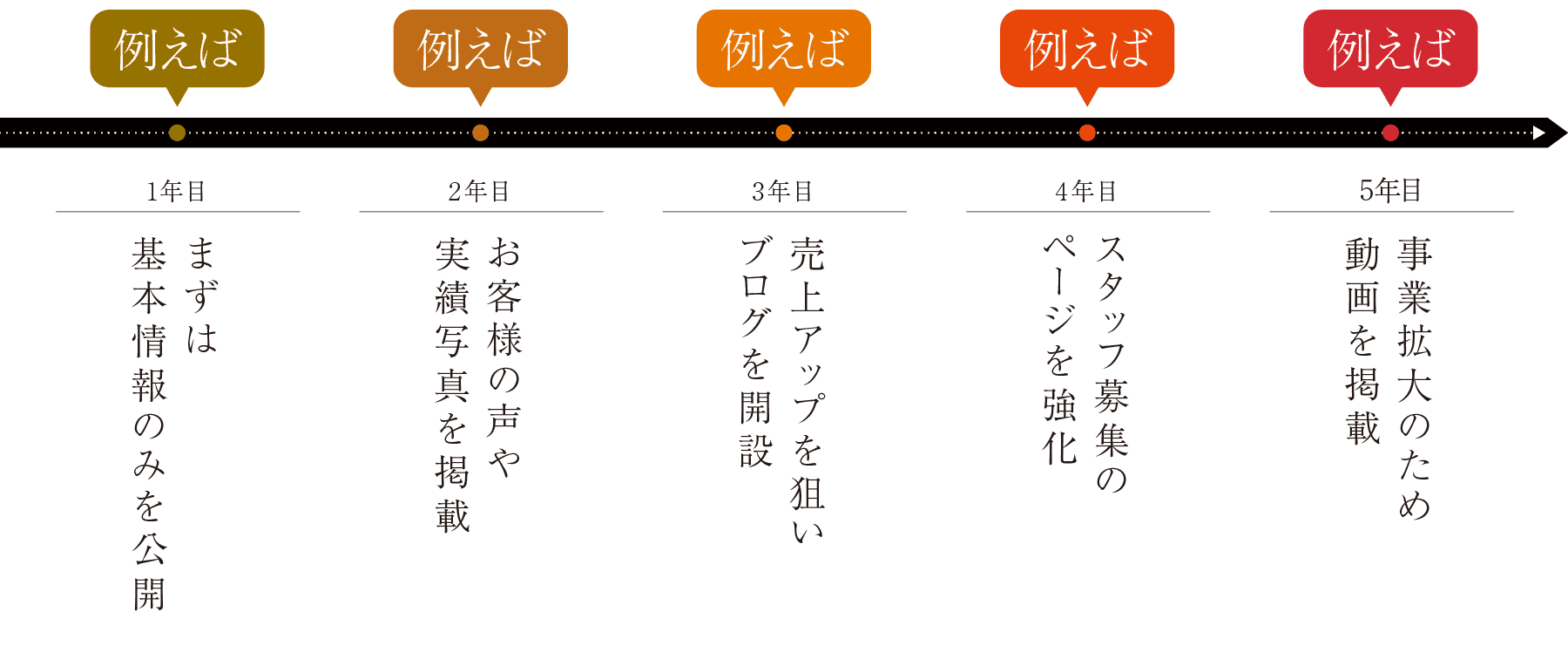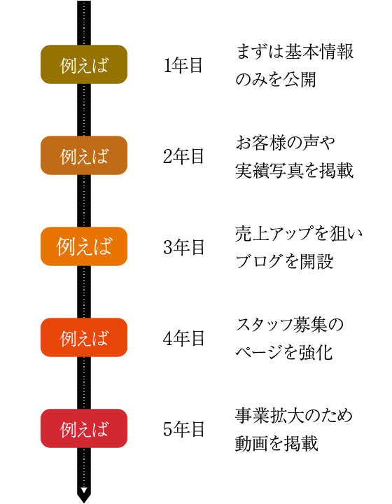 年月を重ねて増やせるコンテンツを初年度から想定して提案。初年度のコストを抑え、事業の成長に応じて適切に拡充できます。